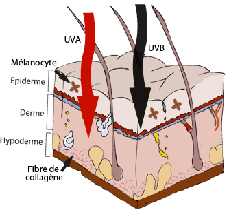 - Les expositions intensives répétées au soleil peuvent être la cause de cancers de la peau : mélanomes et carcinomes. - Les UVB, très énergétiques, provoquent des altérations de l'ADN des cellules de l'épiderme et sont ainsi directement responsables de cancers de la peau. - Les UVA n'ont pas de toxicité directe sur l'ADN, mais ils sont à l'origine de la production de radicaux libres, molécules très réactives qui déclenchent des réactions en chaîne et vont engendrer des modifications sur l'ADN, les protéines et les lipides de la peau. Ils contribuent donc aussi à la formation de cellules cancéreuses. - Les altérations de l'ADN sont normalement repérées et réparées au sein des cellules. Et si, une cellule devient cancéreuse, elle est rapidement considérée comme étrangère et éliminée par le système immunitaire. - Cependant, en cas d'expositions trop intenses et fréquentes, les mécanismes de réparation naturelle deviennent insuffisants. Et comme les défenses immunitaires cutanées sont affaiblies par les expositions aux UV, l'élimination des cellules cancéreuses ne sera plus totalement assurée. |
