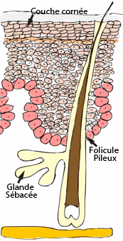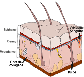 Le derme renferme également la base des poils, les glandes sudoripares, responsables de la transpiration ainsi que les glandes sébacées, responsables de la sécrétion du sébum. L'hypoderme est la couche la plus profonde de la peau. Cette couche est riche en graisse et en vaisseaux sanguins. Son rôle est d'amortir les pressions auxquelles la peau est soumise et de protéger l'organisme des variations de température. |