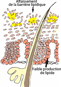 Les raisons de la sécheresse cutanée sont multiples : la couche cornée manque d’eau, le film hydrolipidique situé à la surface est trop fin ou abîmé et ne protège plus la peau, le sébum vient à manquer… La peau se tend et tire puis desquame.