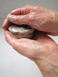 Savon recouvert d'une fine couche de poudre blanche à grisâtre |