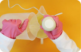 Eloignez-vous en laissant le récipient en place. Remuez de temps en temps et attendre la dissolution complète de la soude et le refroidissement de la solution jusqu’à environ 35-50°C avant de l’utiliser. |