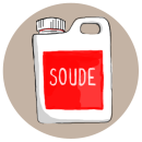 Hydroxyde de sodium - sous forme solide (pure) ou liquide (diluée dans l'eau) Elle sert à transformer les huiles en savon.