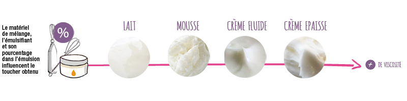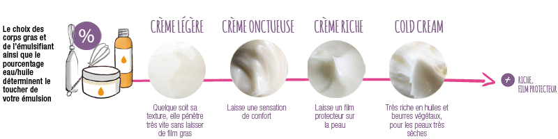 Selon l'émulsifiant choisi, il est possible d'obtenir une large gamme de textures différentes plus ou moins épaisses et plus ou moins riches : laits, crèmes fluides, crèmes légères, crèmes onctueuses, crèmes épaisses, cold cream...