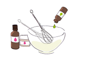 | Versez petit à petit la phase B dans la phase A en agitant lentement entre chaque ajout pour obtenir un mélange homogène. | Transférez vos actifs dans la préparation et mélangez jusqu'à obtenir une pâte homogène. Ajoutez ensuite vos extraits aromatiques et/ou huiles essentielles. | |||||