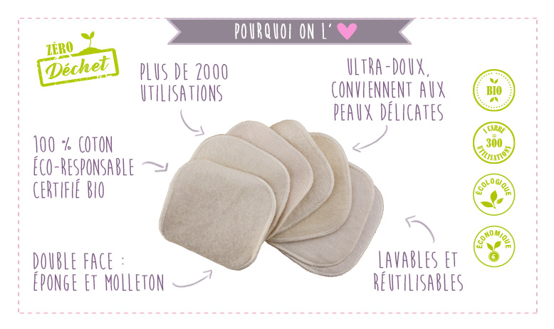 Économiques et zéro déchet, ces carrés lavables en coton BIO double face sont parfaits pour démaquiller le visage en douceur, nettoyer efficacement la peau et appliquer des soins toniques.