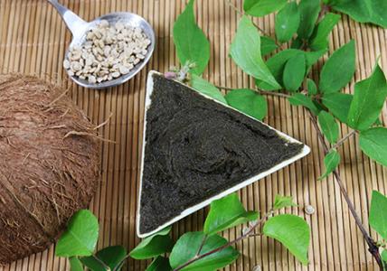 1/ Mélangez les poudres de fenugrec et de bhringaraj et l'huile de coco dans un bol.