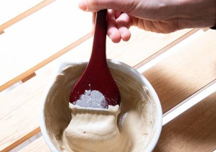 Dans un bol, mettez l'ensemble des ingrédients puis incorporez de l'eau tiède jusqu’à obtention d’une pâte. La consistance finale doit être proche de celle d’un yaourt nature.