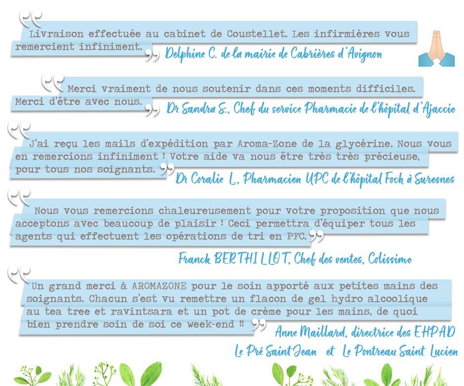 Compte tenu de la crise actuelle liée au Covid-19, les équipes d’Aroma-Zone ont décidé de se mobiliser pour venir en aide au personnel soignant et aux professionnels au service de la population qui font vivre nos commerces d’alimentation, nos pharmacies, nos maisons de retraite …