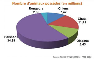 | • 48.4% de foyers possèdent au moins un animal de compagnie soit près d'un foyer sur deux • 7,42 millions de chiens • 11,41 millions de chats • 34,99 millions de poissons • 48.7% des possesseurs de chien estiment que leur chien leur apporte du bien-être • 48% des possesseurs de chien pensent qu'il contribue au développement de leur enfant (Enquête FACCO/TNS SOFRES) |