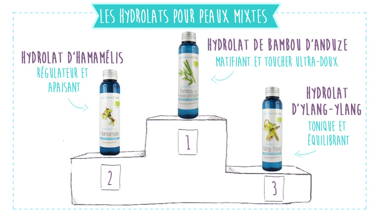 Grasses sur la « zone T » (front, nez, menton) et sèches sur le reste du visage, les peaux mixtes sont un véritable casse-tête et souvent inconfortables. On choisira des hydrolats qui équilibrent en douceur la sécrétion de sébum.