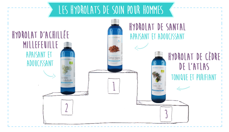 Les hommes ne sont pas en reste et apprécieront aussi les hydrolats dans leurs soins quotidiens, à choisir en fonction de leur type de peau. L’hydrolat de santal sera particulièrement apprécié pour son odeur boisée et ses propriétés apaisantes, notamment après le rasage. L’hydrolat d’Achillée millefeuille, apaisant et réparateur, est traditionnellement réputé pour les soins après-rasage également. Enfin, l’hydrolat de Cèdre de l’Atlas, autre note boisée appréciée, sera l’allié des peaux épaisses et grasses.