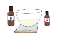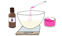 Je pèse la base vernis et les paillettes naturelles dans un bol |