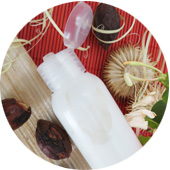 Le fruit de murumuru, rouge à maturité, renferme une amande dont la pression fourni un beurre à très forte concentration en acide laurique. De très faible poids moléculaire, cet acide gras assure à ce beurre un toucher parfaitement sec. Il présente également la particularité de posséder une très forte affinité pour les protéines du cheveu. Le beurre de Murumuru est donc un beurre incontournable pour nourrir les cheveux secs et abîmés. |