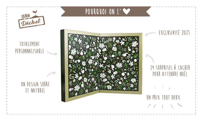Quel plaisir que d'attendre Noël en découvrant chaque jour l’un des 24 cadeaux dissimulés derrière les petites fenêtres de son Calendrier de l'Avent ! Habillé d'un joli design aux prédominances de vert, de rouge, de blanc et de doré, notre Calendrier de l'Avent DIY 2021 s'accordera à merveille avec votre déco de Noël. Entièrement personnalisable, il vous revient d'y glisser les 24 petits cadeaux que vous souhaitez nicher derrière ses volets. Soit, en optant pour l'une des 3 sélections de 24 produits pensées autour de nos thématiques Beauté & Bien-être au naturel (Cosmétique maison, Aromathérapie et Beauté Nature), soit en y glissant bonbons, chocolats et autres idées nées de votre imagination !