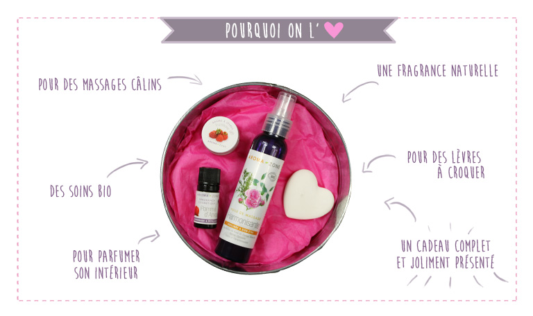 Ode à l’amour, ce coffret envoûtant dévoile une sélection de soins BIO irrésistibles. Découvrez une huile de massage harmonisante et voluptueuse, un baume à lèvres à croquer, un joli galet en forme de cœur à parfumer et la fragrance mutine Pomme d’Amour. Un coffret pour les amoureux… mais pas que !