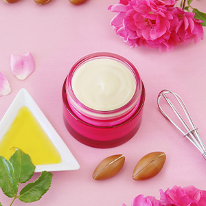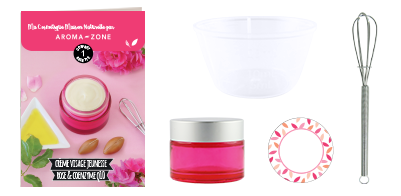 Le kit "cosmétique maison" complet pour réaliser deux fois votre crème visage nourrissante et régénérante à la divine odeur de rose. Soin de jour ou de nuit adapté à tous les types de peaux, cette crème fondante est un véritable élixir de jouvence! Elle associe l'huile d'Argan et la Coenzyme Q10 pour préserver la jeunesse de la peau et lutter contre les signes de l'âge. Sa délicate odeur de pétales de rose et sa texture fine et onctueuse font de ce soin un réel moment de plaisir. Apprenez à fabriquer vos cosmétiques maison en toute simplicité avec ce coffret recette Aroma-Zone. À vous de jouer !