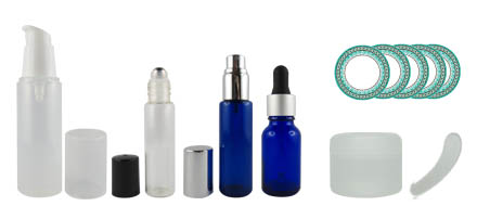 1 flacon airless Trendy 30 ml 1 flacon roll-on 15 ml en verre transparent 1 flacon vaporisateur en verre bleu 30 ml 1 flacon compte-goutte 15 ml en verre bleu 1 pot 30 ml translucide 1 petite spatule cosmétique De jolies étiquettes pour identifier vos créations |