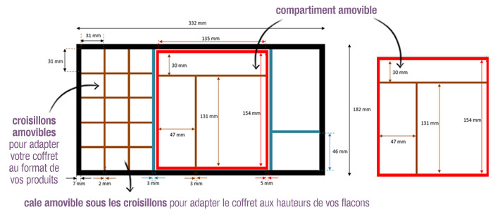 UtilisationsCe coffret de rangement est proposé avec des croisillons vous permettant de ranger 15 flacons allant de 0,5 ml à 10 ml. Au centre, des compartiements permettent de ranger ingrédients et ustensiles de fabrication. Cales et croisillons peuvent être retirés pour ranger d’autres types de produits ou bien pour utiliser le coffret comme emballage cadeau. ![]() | |