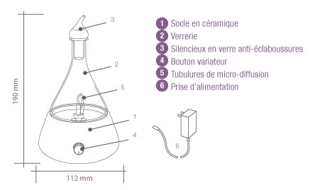 Caractéristiques techniques du diffuseur- Mode de fonctionnement : fonctionne par effet Venturi, utilisant une pompe qui pulse l'air à la surface de l'huile essentielle pour former de très fines gouttelettes dispersées dans l'air. Il s'agit d'un système de diffusion à froid qui n'altère pas la qualité des huiles essentielles. Ce procédé de diffusion est sans danger pour les hommes et le animaux.- Espace de diffusion : de 20 à 80 m² - Puissance de diffusion : environ 0,80 ml/h à puissance maximale (huile essentielle d'Orange) - Niveau sonore : environ 30 dB - Intensité de diffusion réglable grâce au bouton variateur. L'intensité augmente jusqu'à atteindre la puissance maximale en tournant le bouton de gauche à droite. - Alimentation : branchement secteur avec un transformateur entrée 240V~50Hz - Sortie 12V - Matériaux : un socle en céramique prune de forme simple et une verrerie fine transparente en verre soufflé - Garantie : 2 ans pièces et main d'oeuvre |