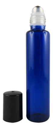 Flacon en verre bleu ou ambré, bille en acier inoxydable & capot en PP