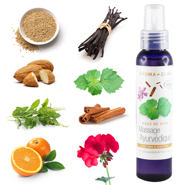 Ingrédients : Sesamum indicum seed oil* (huile végétale de sésame BIO), Oryza sativa bran oil* (huile végétale de son de riz BIO), Gossypium herbaceum seed oil* (huile végétale de coton BIO), Prunus amygdalus dulcis oil* (huile végétale d'amande douce BIO), Pelargonium graveolens oil* (huile essentielle de géranium bourbon BIO), Amyris balsamifera bark oil (huile essentielle d'amyris), Citrus sinensis peel oil expressed (huile essentielle d'orange douce), Vanilla planifolia fruit extract* (extrait de vanille BIO), Pogostemon cablin leaf oil (huile essentielle patchouli), Aniba rosaeodora leaf oil* (huile essentielle bois de rose BIO), Ocimum sanctum leaf oil (huile essentielle de basilic sacré), Cinnamomum cassia leaf oil* (huile essentielle de cannelle de chine BIO), Benzyl benzoate, Cinnamal, Citral, Citronellol, Coumarin, Eugenol, Farnesol, Geraniol, Limonene, Linalool.