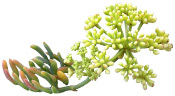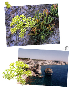 Plante charnue comme gonflée d’eau qui rappelle le fenouil, elle a pour particularité de pouvoir survivre au sel apporté par l’air marin et les vagues. Son nom latin Crithmum maritimum (du grec crithé qui signifie « orge ») provient de ses fruits qui ont la forme d’un grain d’orge et qui ont la capacité de flotter sur l’eau. |