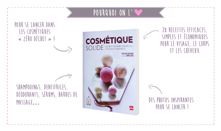 « Zéro déchet », faciles à transporter, à conserver et à offrir : les cosmétiques solides révolutionnent notre salle de bain ! Plus concentrés en actifs que les produits liquides, les cosmétiques solides se déclinent pour tous nos soins : shampooing, dentifrice, déodorant, sérum pour le visage, contour des yeux… tout est possible ! Au fil de ses 28 recettes de cosmétiques sains et économiques, ce livre nous prouve que l’on peut créer des soins de beauté efficaces pour la peau et les cheveux, tout en faisant du bien à la planète ! A vous de jouer !