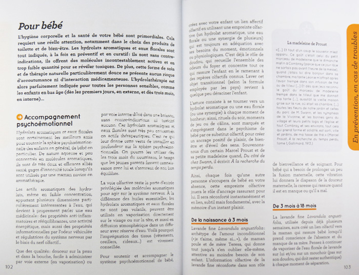 Ce livre très pratique propose un guide des eaux florales et hydrolats pour la grossesse, le bébé et la jeune maman. Douces, fraîches et moins concentrées que les huiles essentielles, les eaux florales sont idéales pour ces périodes de la vie. Vous y trouverez des conseils pratiques et recettes pour des utilisations très variées et utiles au quotidien.