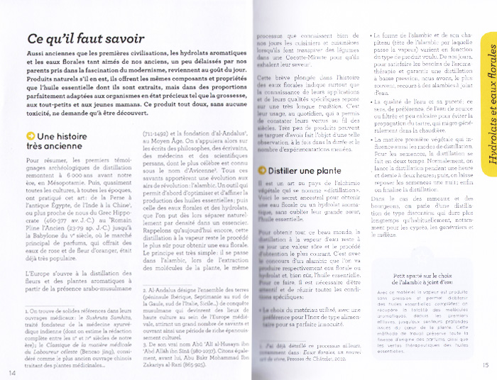Ce qu'il faut savoir sur les hydrolats et eaux florales :Découvrez un historique ainsi qu'un descriptif du mode d'obtention des hydrolats et eaux florales pour mieux comprendre leur intérêt. Enfin, un guide des plantes vous est proposé indiquant leurs bienfaits et utilisations.
