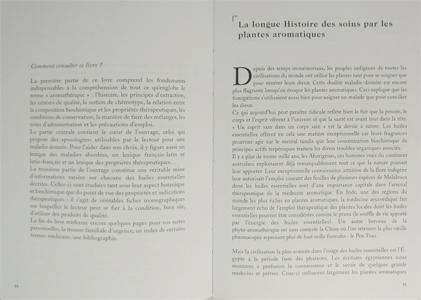 Première partie : Elle précéde les pages grisées et constitue une large introduction à l’aromathérapie. Elle raconte l'histoire des soins par les plantes aromatiques, nous inculque quelques notions de botanique et d'extraction des huiles essentielles. Elle nous fait part également du rôle, de l'efficacité, des effets indésirables, des précautions d'emploi, etc des huiles essentielles.