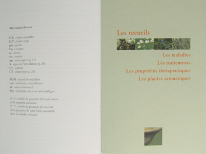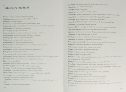 Deuxième partie : Les pages grisées, à savoir la seconde partie du livre,représentent un ABC des symptômes et maladies, un recueil des différents traitements mais également un lexique des plantes en français avec leur correspondance en latin.