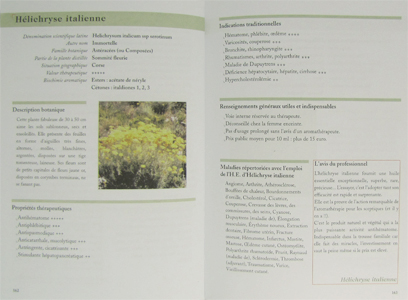 Troisième partie : La partie faisant suite aux pages grisées constitue la troisième partie en présentant soixante et onze huiles essentielles sur une double page pour chacune d'entre elles avec photographie couleur à l’appui : Ajowan, Angélique, Basilic exotique, Bergamote, Bois de rose, Bois de Siam, Cajeputier, Camomille noble, Cannelle de Chine, Cardamone, Carotte cultivée, Céleri cultivé, Ciste ladanifère, Citron, Citronnelle de Java, Combawa, Coriandre, Cumin des prés, Cyprès de Provence, Encens, Epinette noire, Estragon, Eucalyptus à bractées multiples, Eucalyptus citronné, Eucalyptus mentholé, Eucalyptus radié, Fenouil doux, Gaulthérie couchée, Genévrier de Virginie, Géranium Rosat, Gingembre, Girofle clou, Hélichryse italienne, Inule odorante, Laurier noble, lavande aspic, Lavande vraie, Lavandin super, Ledon du Groënland, Lentisque Pistachier, Litsée citronnée, Mandarine, Mandravasarotra, Marjolaine des jardins, Matricaire, Menthe citronnée, Menthe des champs, Menthe poivrée, Muscadier, Myrte verte, Niaouli, Orange douce, Origan compact, Palmarosa, Patchouli, Petitgrain bigarade, Pin sylvestre, poivre noir, Ravintsara, Romarin CT à Cinéole, Romarin CT à Verbénone, Rose de Damas, Sapin baumier, Sarriette des montagnes, Sauge sclarée, Tea tree, Thym CT thujanol, Thym CT thymol, Thym saturéoïdes, Verveine citronnée, Vétiver, Ylang Ylang.