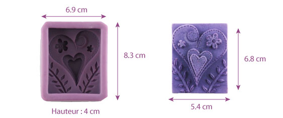Moule : L 8.3 cm x l 6.9 cm x H 4 cm - Savon : L 6.8 cm x l 5.4 cm - Poids du savon : 100 g environ