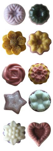 - Savons : 12 formes différentes (L moy 45mm x l moy 40mm x p moy 25mm)