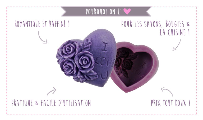 Un moule en silicone romantique et raffiné pour faire vos plus belles déclarations avec un savon maison. Très élégant, il sublimera vos créations en saponification à froid et Melt & Pour. Polyvalent, il sera également parfait pour créer des pâtisseries, galets de massage, shampooings solides…