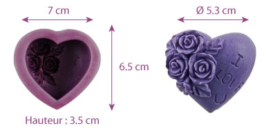 Moule : L 6.5 cm x l 7 cm x H 3.5 cm - Savon : ∅ 5.3 cm - Poids du savon : 50 g environ