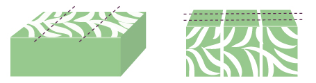 Après démoulage, coupez votre savon en 3 parts égales puis basculez chaque part de savon sur la tranche et coupez-la en 3 dans le sens de la longueur afin de faire apparaître le marbrage.