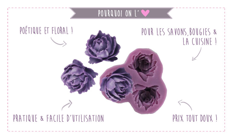 Ce moule en silicone de trois Pivoines délicates peut s'utiliser seul ou pour réaliser de très belles incrustations dans vos savons maison.