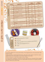 Enrichies d’astuces et de conseils, ces fiches recettes vous guideront étape par étape dans la confection de divers produits cosmétiques (crèmes, laits, gels huileux, lotions, gels douche, shampooings,…) aux textures, senteurs et usages variés avec un minimum de matériel requis.