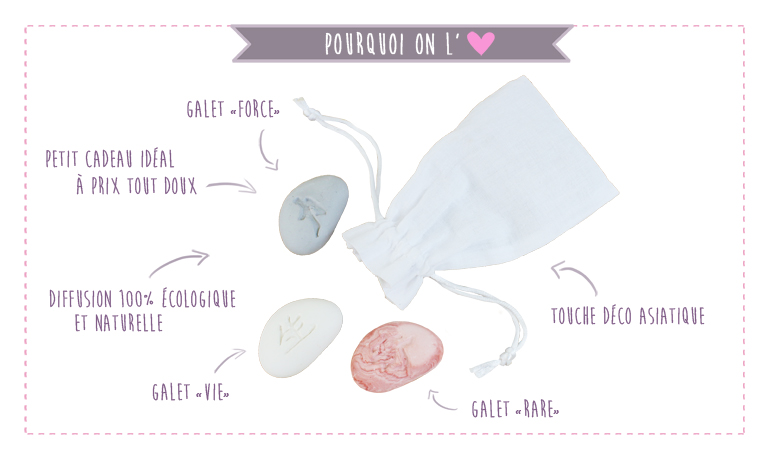 Pour une harmonie parfaite, les trois galets sont de couleurs différentes : écru, gris clair et rose pâle. Le tout joliment emballé dans un sachet en coton blanc légèrement transparent noué par un cordon. C'est aussi une très jolie idée cadeau !