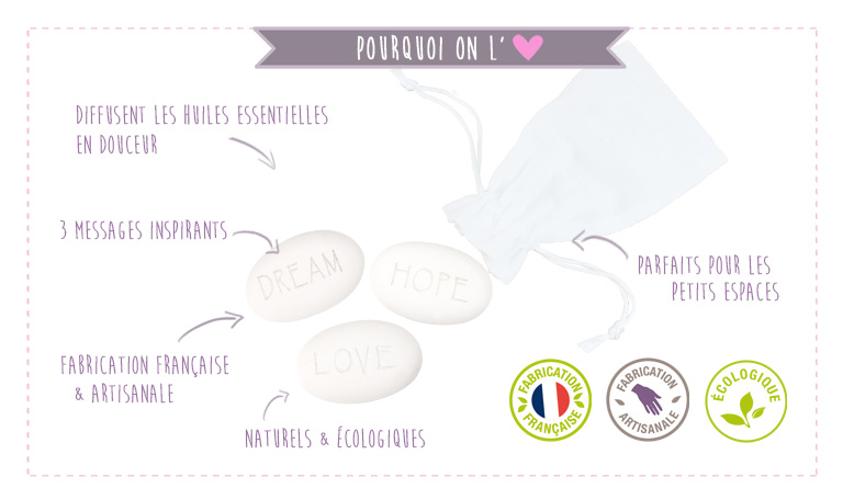 Ces trois galets à parfumer naturels portent des messages positifs et inspirants : Hope, Dream, Love. Ils diffusent les huiles essentielles en douceur par capillarité. Parfaits pour les petits espaces, leur format nomade vous permet de les emporter partout avec vous.