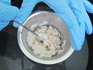 Mélanger à l'aide d'un pilon pendant la chauffe jusqu'à obtenir une pâte collante. |
