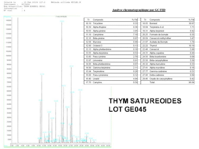 Chaque lot d'huile essentielle est contrôlé par notre laboratoire, nous certifiant la conformité des critères physico-chimiques de chaque huile, sa pureté et sa composition précise. Nous disposons ainsi pour chaque lot d'une chromatographie phase gazeuse (HEBD).