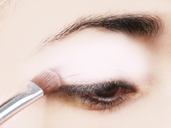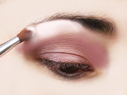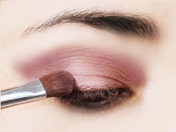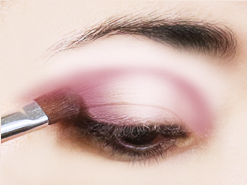 Appliquer à l’aide d’un pinceau plat, la couleur rose lunaire sur toute la paupière mobile et débordant sur la paupière fixe