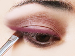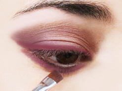 Appliquer au coin externe, à l’aide d’un pinceau plat, la couleur myrtille en étirant la couleur dans le creux de paupières jusqu’au coin interne